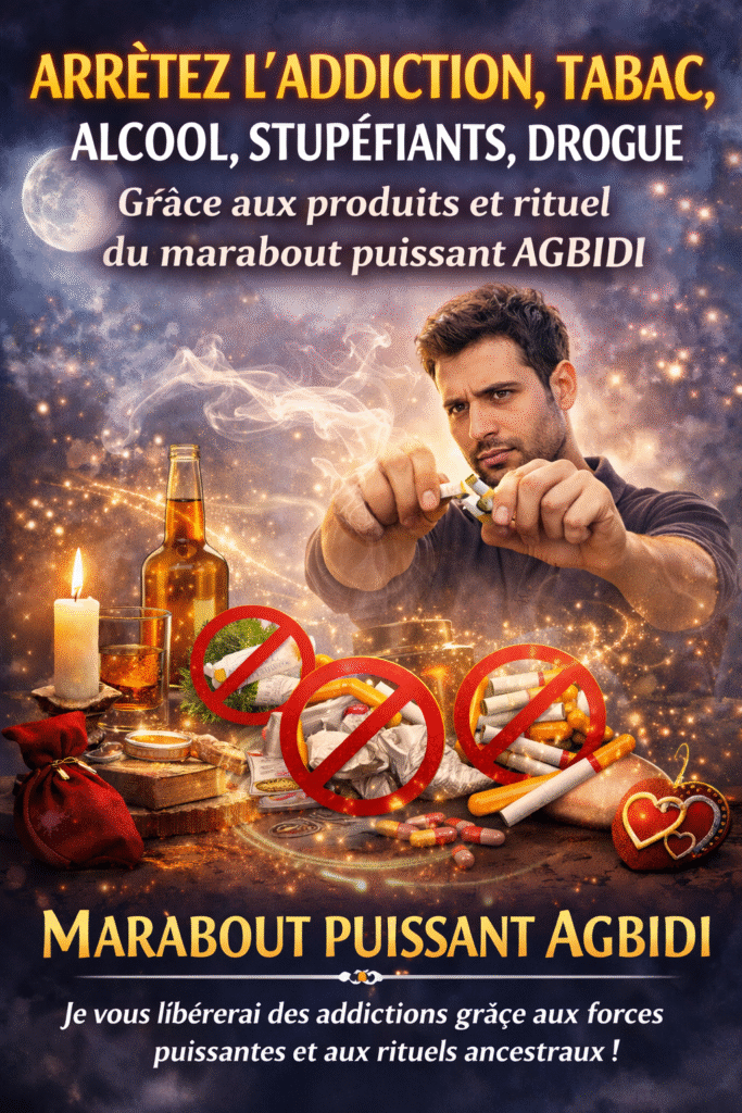 Arrêtez l’alcool, le tabac, les drogues et autres substances nocives grâce aux solutions puissantes et naturelles du marabout Agbidi. Ses produits et rituels ancestraux vous aident à reprendre le contrôle de votre vie, à retrouver énergie et sérénité, tout en renforçant votre bien-être mental et physique.